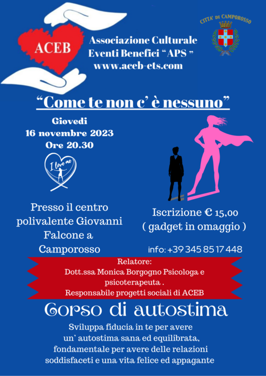 Giovedì 16 novembre alle 20.30 vi sarà un corso di autostima presso la sala polivalente Giovanni Falcone a Camporosso, evento patrocinato dalla città di Camporosso. "Sviluppa fiducia in te per avere un'autostima sana ed equilibrata, fondamentale per avere delle relazioni soddisfacenti e una vita felice ed appagata" - dicono gli organizzatori - "Prenota la tua partecipazione scrivendo su WhatsApp al n° +39 345 85 17448: Partecipo al corso di autostima, il tuo nome e cognome. Iscrizione 15,00 euro a persona più gadget in omaggio. L’autostima comprende: la soddisfazione di sé, l’intima consapevolezza del proprio valore e la fiducia nella propria capacità di svolgere un determinato compito. Stimare noi stessi significa non mettere in discussione la nostra importanza e, di conseguenza, essere capaci di assumersi responsabilità nei confronti degli altri. Il rispetto per noi stessi, per i nostri bisogni, emozioni, potenzialità, aiuta ad entrare in un rapporto costruttivo con gli altri. Se questo rispetto manca (bassa autostima), anche il rapporto con gli altri ne viene profondamente condizionato. L’autostima è una valutazione che la persona dà di se stessa, è l’opinione generale, il valore che si attribuisce come persona. Tale valutazione varia tra due estremi: uno positivo ed uno negativo. Il corso è tenuto dalla dottoressa Monica Borgogno, psicologa, psicoterapeuta e responsabile dei progetti sociali di Aceb".