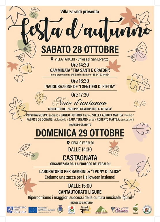 Si svolgerà a Villa Faraldi, sabato 28 e domenica 29 ottobre, la prima edizione della "Festa d'Autunno”, un ricco programma di iniziative dedicate al territorio comunale, alle sue bellezze storiche e artistiche. Saranno due giorni di eventi realizzati in collaborazione con la neo nata Pro Loco dei Faraldi, l’Associazione Culturale Alchimea, Nora Studio, e la partecipazione della cittadinanza.