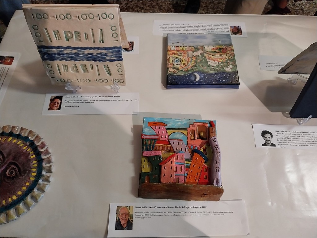 Dichiara l’artista Serenella Sossi: “Sono due mostre volute per la commemorazione del centenario di Imperia, la prima dedicata alle mattonelle, la seconda edizione di ‘Mattonelle al Parasio’. Presentiamo quaranta artisti che donano la loro opera per questa manifestazione.