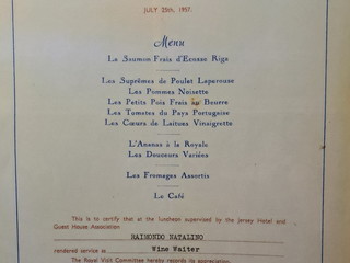 Nella metà degli anni ’50 ecco arrivare una grande opportunità che lo porta a fare le valige e passaporto per andare sull’isola di Jersey presso il Grand Hotel Woodville. E’ in questa isola britannica che ha servito la persona più importante della sua vita professionale, portandosi dietro un ricordo ancora vivo ( ed anche il menu’ originale)……la Regina Elisabetta d’Inghilterra. Per questo evento fu’ scelto per la sua naturale eleganza nel servire a tavola e per la maestria nel districarsi in situazioni molto delicate. Ricorda un piccolo aneddoto, per servire la Regina gli cucirono un Frac su misura nel famoso negozio d’abbigliamento BURTON, pensate che per confezionare un abito così importante, occorrevano oltre tre mesi…. Avendo saputo che faceva parte dello staff che doveva servire la Regina, lo consegnarono in una sola settimana.