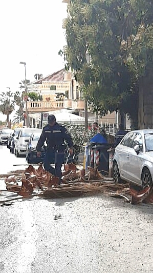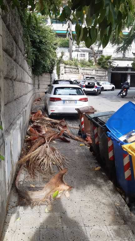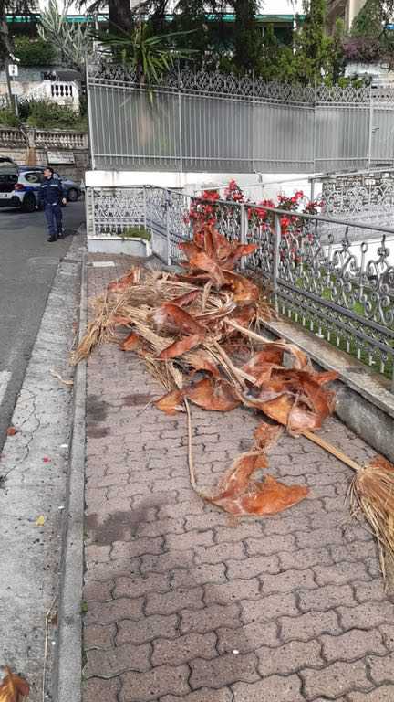Problemi anche in corso Inglesi dove la strada è stata ricoperta da numerose foglie secche di palma staccatesi dagli alberi di villa Angerer.