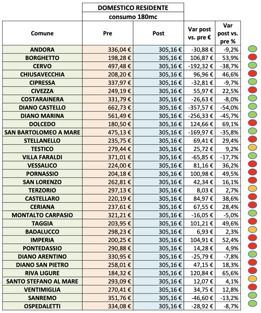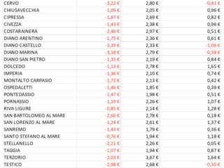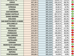 Il risparmio maggiore lo vedranno i cittadini di Diano Castello e sarà pari al -54% mentre la stangata peggiore sarà per Dolcedo con il 69,1% in più. Vediamo le differenze comune per comune, partendo da Andora con -9,2%, Borghetto D’Arroscia +53,9%, Cervo, -38,7%, Chiusavecchia +46,6%, Cipressa -9,7, Civezza +22,5%, Costarainera -8%, Diano Marina -45,7%, San Bartolomeo al Mare – 35,8%, Stellanello +29,4%, Testico +9,2%, Villa Faraldi -17,7%, Vessalico +36,2%, Pornassio +49,5%, San Lorenzo al Mare +16,1%, Terzorio +2,7, Castellaro +38,6%, Ceriana +28,4%, Montalto Carpasio -5%, Taggia +49,6%, Badalucco +2,4%, Imperia +52,4%, Pontedassio +4,9%, Diano Arentino -7,8%, Diano San Pietro +18,3%, Riva Ligure +65,6%, Santo Stefano al Mare +4,1%, Ventimiglia +12,8%, Sanremo -13m2% ed Ospedapetti -8,7%