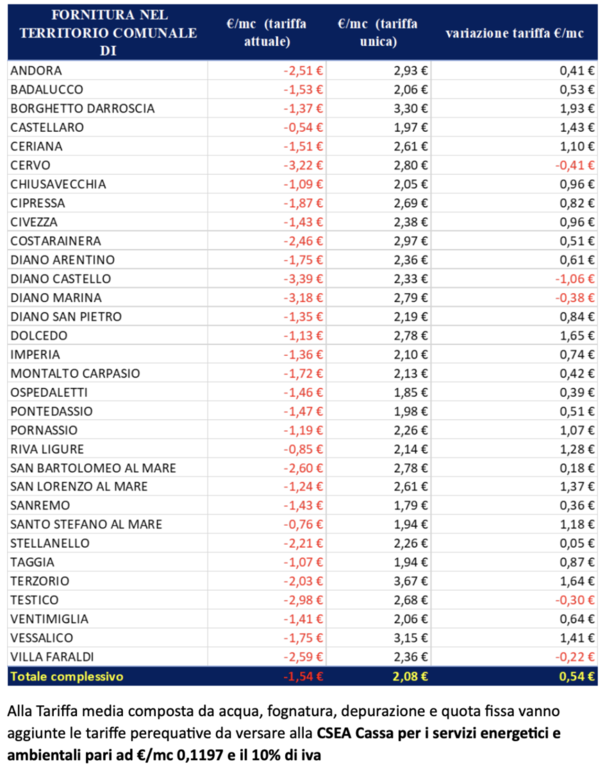 Al momento non fanno parte del conteggio una serie di comuni del comprensorio ventimigliese come Airole, Apricale, Bordighera, Camporosso, Perinaldo e Vallecrosia che sono stati gestiti, nel recente passato, da iReti ma anche Pieve di Teco, entrati in Rivieracqua dopo il via al calcolo della tariffa unica.