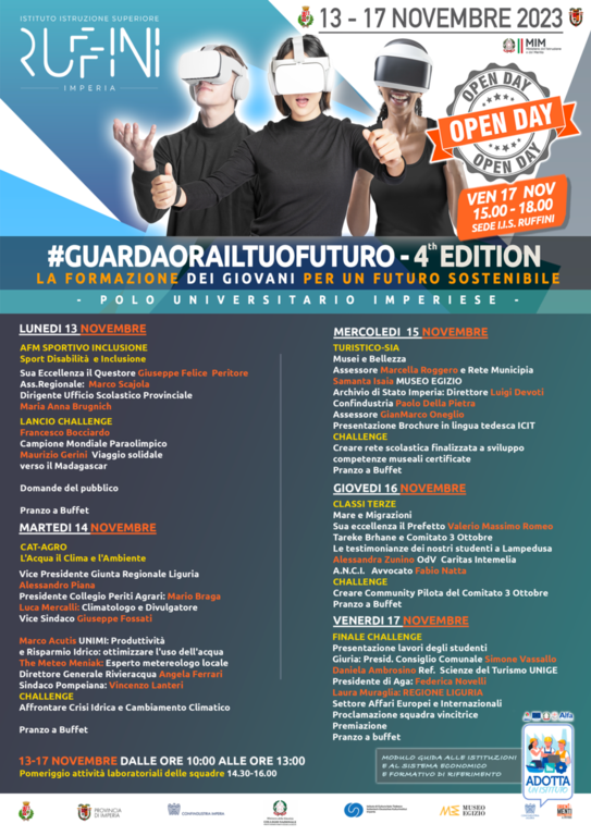 Anche quest'anno il Ruffini di Imperia organizza dal 13 al 17 Novembre 2023 l'evento #guardaorailtuofuturo. Il tema di questa quarta edizione sarà 'La Tecnologia per il Sociale'. Ci saranno relatori e testimonial legati ai corsi della nostra Scuola ma in un'ottica più ampia affrontando ogni giorno tematiche complesse e attuali.