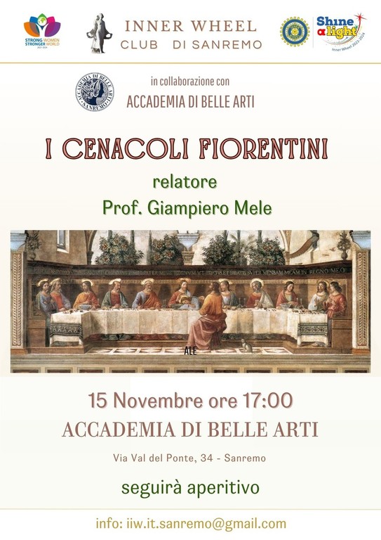 L’Inner Wheel Club di Sanremo ha rinnovato la collaborazione con l’Accademia di Belle Arti di Sanremo: mercoledì alle 17 nella sede dell'Accademia verranno illustrati i “Cenacoli Fiorentini”. Relatore sarà il prof. Mele, direttore dell'Accademia matuziana e dell’Accademia del lusso, presidente di IAMAI, docente universitario, ricercatore e relatore in convegni internazionali.