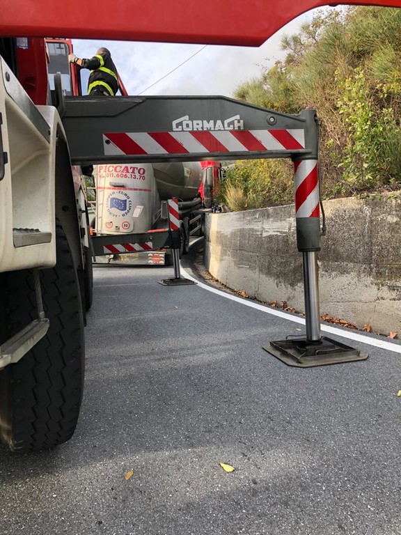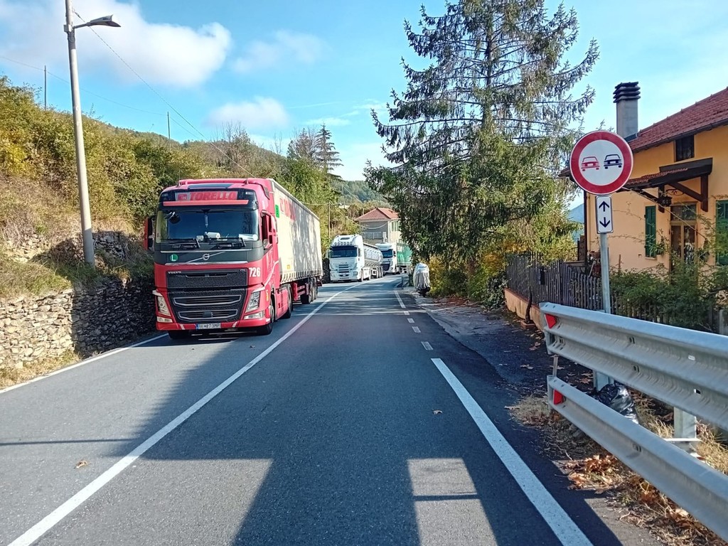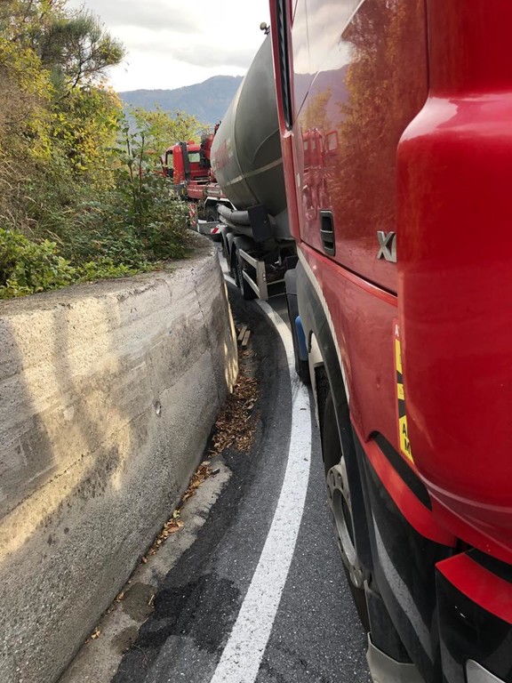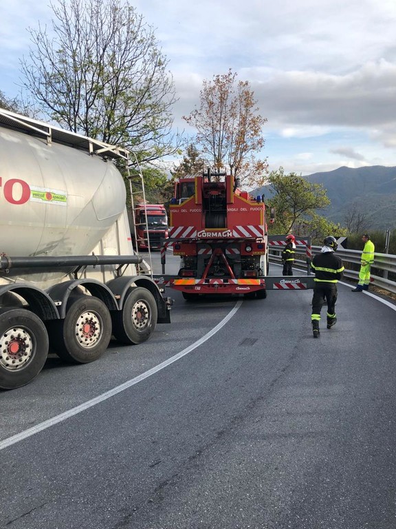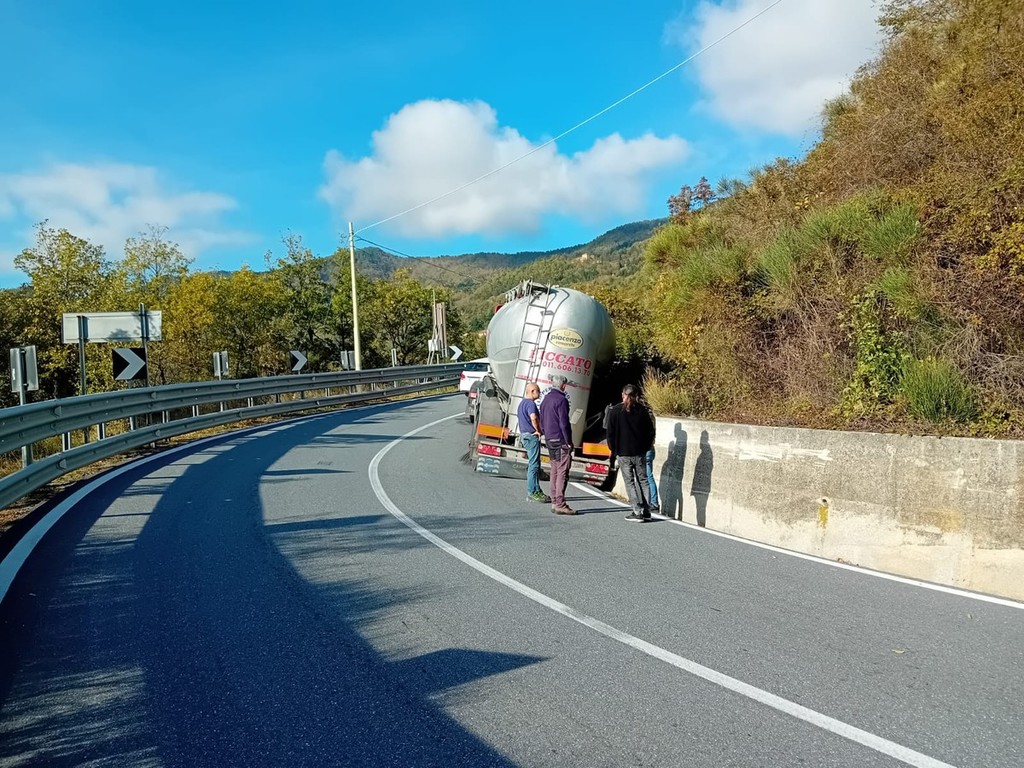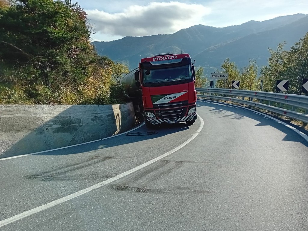 Pornassio, tir bloccato fra i tornanti della 28: servono i vigili del fuoco per liberare la strada (foto)