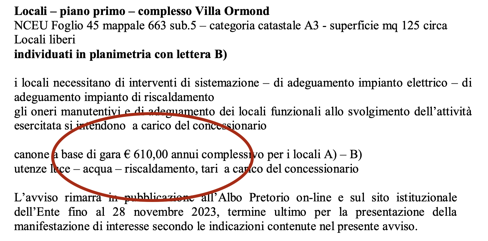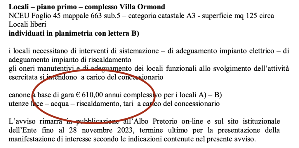 C’è stato un errore: il canone per l’affitto del piano terra e del primo piano di Villa Ormond non è di 610 euro all’anno, ma di 610 euro…al mese.