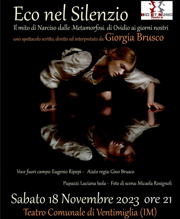 "Eco nel Silenzio. Il mito di Narciso dalle Metamorfosi di Ovidio ai giorni nostri" andrà in scena domani sera, il 18 novembre, alle 21 al teatro comunale di Ventimiglia. Lo spettacolo teatrale, scritto, diretto e interpretato da Giorgia Brusco, è organizzato dall'Aceb - Associazione Culturale Eventi Benefici di Camporosso.