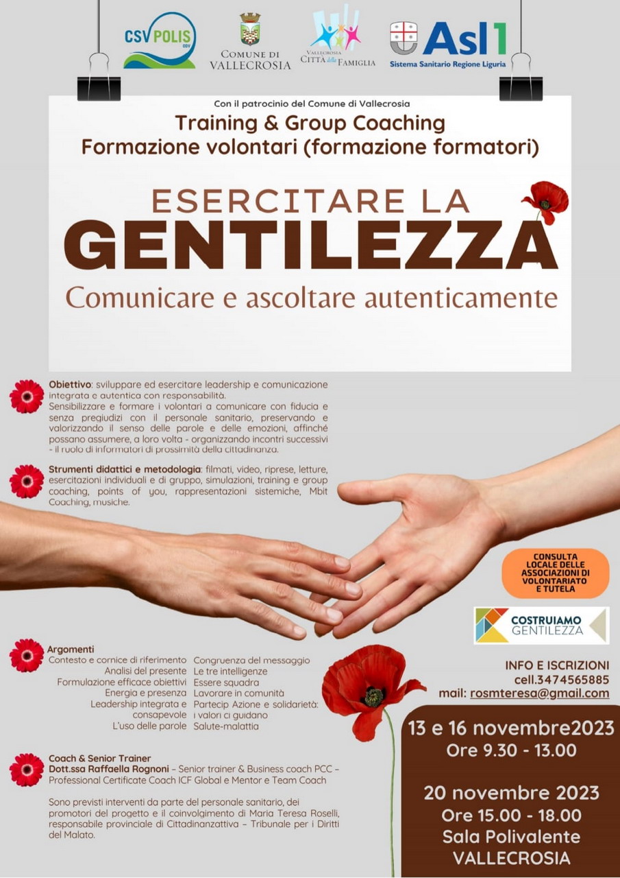 15.00-18.00. Corso di formazione relativo al progetto ‘Esercitare la Gentilezza - Comunicare e Ascoltare Autenticamente’ rivolto ai volontari delle Associazioni e ai cittadini interessati. Sala Polivalente del Comune, partecipazione libera (locandina)