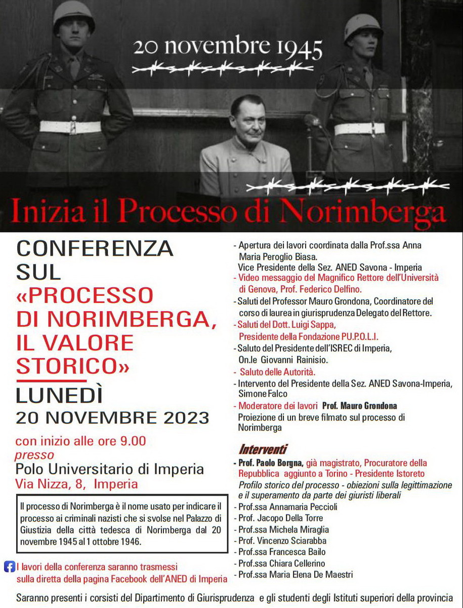 9.00. Conferenza dal titolo ‘Processo di Norimberga il valore storico’ organizzata dall’Aned Savona–Imperia con interventi di vari relatori + proiezione filmato con immagini in originale del Tribunale Militare Internazionale, composto da giudici delegati da Gran Bretagna, Francia, Stati Uniti e Urss e i noti imputati gerarchi nazisti alla sbarra. Aula Magna del Polo Universitario (più info)