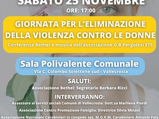 Un convegno dedicato alla giornata contro la violenza sulle donne si terrà sabato 25 novembre alle 17 presso la Sala Polivalente di Vallecrosia. L'evento verrà organizzato dalle associazioni Bethel odv, Le 5 Torri, Pergolesi, Associazione Nazionale Carabinieri e Centro Promozione Famiglia Sanremo.