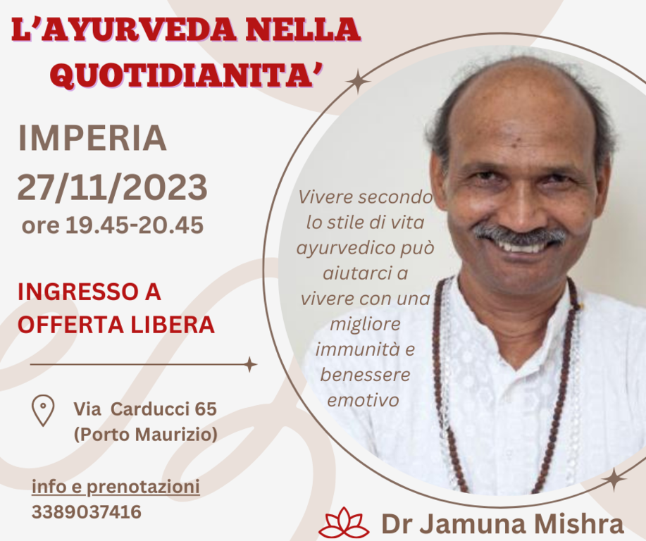 Si terrà lunedì sera 27 novembre, dalle 19.45 alle 20.45 , presso la sede della Società Operaia di Mutuo Soccorso di Imperia in via Carducci 65, la conferenza ad ingresso libero 'L’Ayurveda nella quotidianità’ tenuta dal Guru indiano Dr. Jamuna Mishra noto come Gurji.