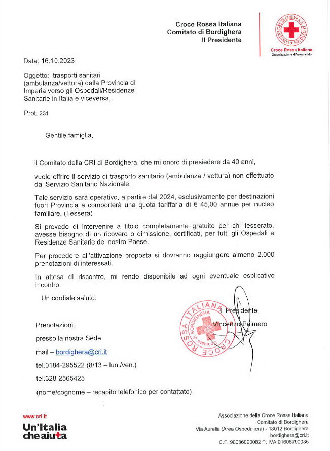 Palmero ha già avuto colloqui con le altre pubbliche assistenze della nostra provincia: “Si sono rese disponibili e questo ci consentirà di poter garantire il servizio alle persone sole e a chi non ha possibilità economiche”. Per potersi informare sull’acquisto della tessera si può chiamare al numero 0184295522 oppure scrivere via mail a bordighera@cri.it.