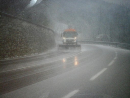 Spazzaneve della Provincia in azione, da questa sera per pulire le strade che sono in questo momento investite dalla nevicata che sta colpendo l’entroterra.
