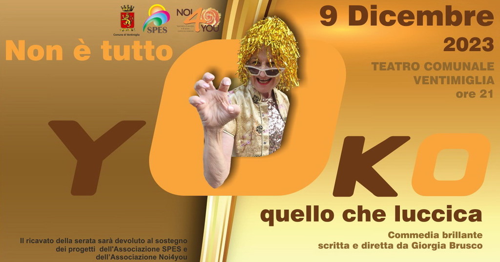 Sabato 9 Dicembre 2023 alle ore 21, la SPES in collaborazione con l'Associazione Noi4You presenta una divertentissima commedia dal titolo 'Non è tutto Yoko quello che luccica' presso il Teatro comunale di Ventimiglia, allestita dagli allievi del corso adulti di Bordighera della Scuola di Teatro Hic et Nunc, diretti da Giorgia Brusco.