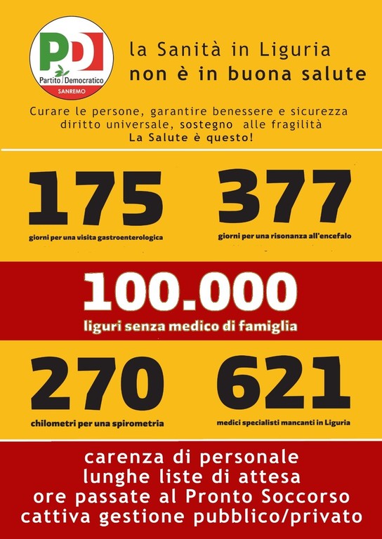 “Le responsabilità di chi governa sono enormi ed è per questo che il Partito Democratico sarà presente venerdì 8 dicembre con un banchetto di informazione per la cittadinanza, ma anche di forte denuncia per le scelte fatte in passato e per quelle che, essendo proprio in questi giorni in corso di delibera a livello regionale, ancora non assicurano il principio costituzionale dell’accessibilità alla cura di tutti i cittadini” conclude Francesca Antonelli, dando appuntamento ai cittadini di Sanremo per il banchetto informativo che il Partito Democratico organizza per venerdì 8 dicembre, in corso Matuzia.