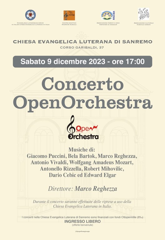 Sabato 9 dicembre alle 17 l'OpenOrchestra diretta da Marco Reghezza si esibirà nell'ormai consueto concerto prenatalizio alla chiesa evangelica luterana di Sanremo.
