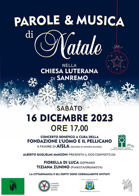 Sabato 16 dicembre alle ore 17 avrà luogo presso la Chiesa luterana di Sanremo un evento musicale benefico a favore di AISLA (Sezione di Imperia). L’evento è organizzato e promosso dalla Fondazione l’Uomo e il Pellicano.