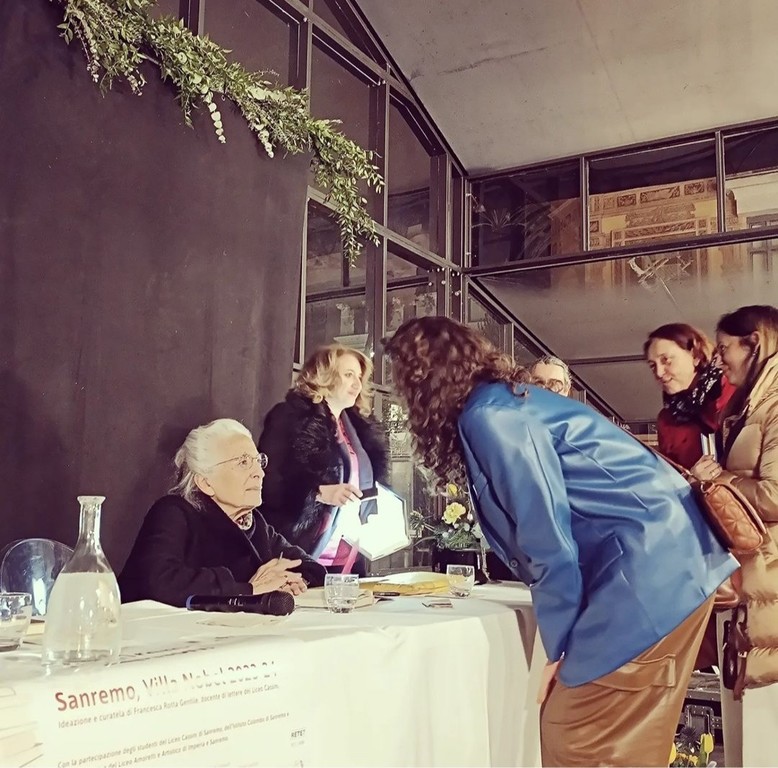 L'incontro è stato presentato dalla professoressa Francesca Rotta Gentile ideatrice del progetto 'Sa(n)remo Lettori' affiancata dal vicesindaco del Comune di Sanremo Costanza Pireri che ha portato i saluti del Sindaco e dell'Amministrazione. Una giovanissima alunna del Liceo Cassini a nome di tutto il grandissimo pubblico ha accolto l'illustre ospite con meravigliose rose bianche di Sanremo.