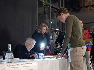 L'incontro è stato presentato dalla professoressa Francesca Rotta Gentile ideatrice del progetto 'Sa(n)remo Lettori' affiancata dal vicesindaco del Comune di Sanremo Costanza Pireri che ha portato i saluti del Sindaco e dell'Amministrazione. Una giovanissima alunna del Liceo Cassini a nome di tutto il grandissimo pubblico ha accolto l'illustre ospite con meravigliose rose bianche di Sanremo.