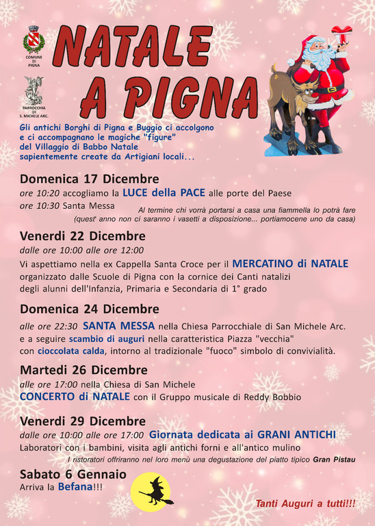"Martedì 26 dicembre alle 17 nella chiesa di San Michele andrà in scena il concerto di Natale con il gruppo musicale di Reddy Bobbio mentre venerdì 29 dicembre dalle 10 alle 17 si terrà la Giornata dedicata ai grani antichi. Vi saranno laboratori con i bambini, visita agli antichi forni e all'antico mulino. I ristoratori, inoltre, offriranno nel loro menù una degustazione del piatto tipico: Gran Pistau" - sottolinea il primo cittadino - "Sabato 6 gennaio, infine, arriverà la Befana. Gli antichi borghi di Pigna e Buggio ci accolgono e ci accompagnano le magiche 'figure' del villaggio di Babbo Natale sapientemente create da artigiani locali. Colgo l'occasione per fare tanti auguri a tutti".