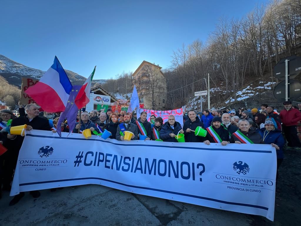 Manifestazione oggi al cantiere del tunnel di Tenda, al grido di #cipensiamonoi e organizzata da Confcommercio. Sono arrivati da Limone Piemonte, dalla valle Vermenagna, da Cuneo e anche dalla vicina Valle Roya per chiedere tempi certi per la riapertura del collegamento internazionale. Commercianti, albergatori, maestri di sci, ambulanti.
