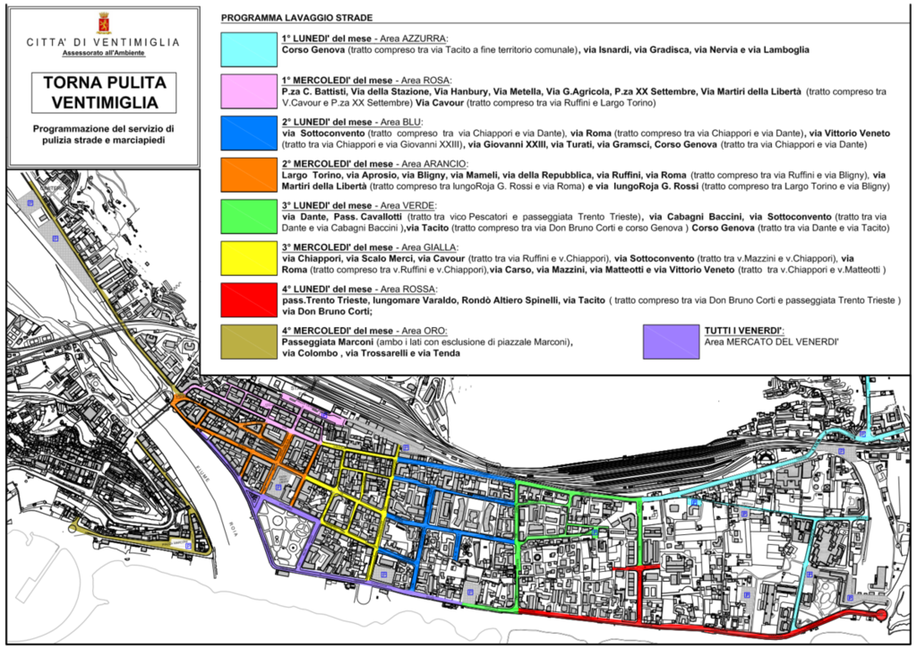 - Il 1 Gennaio 2024, 1° Lunedì del mese, sarà sospeso il servizio di lavaggio all’interno dell’Area AZZURRA [Corso Genova (tratto compreso tra via Tacito a fine territorio comunale), via Isnardi, via Gradisca, via Nervia e via Lamboglia] e riprogrammato per il giorno Giovedì 4 Gennaio 2024.