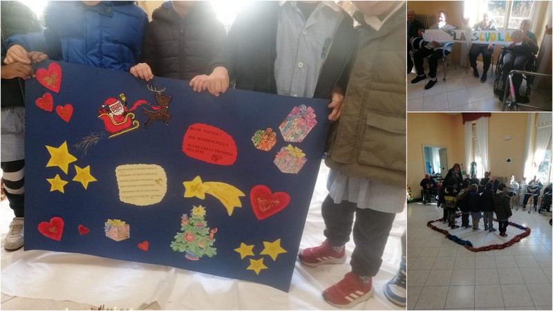 Da buoni vicini, il gruppo dei bimbi più grandi, tra i 4 e i 5 anni, accompagnato dalle maestre Marta e Claudia, è giunto alla residenza Chiappori per fare gli auguri di Natale e rallegrare i presenti con filastrocche e canzoncine che hanno riscosso applausi e ringraziamenti commossi. Per l'occasione hanno anche preparato un bel bigliettone augurale.