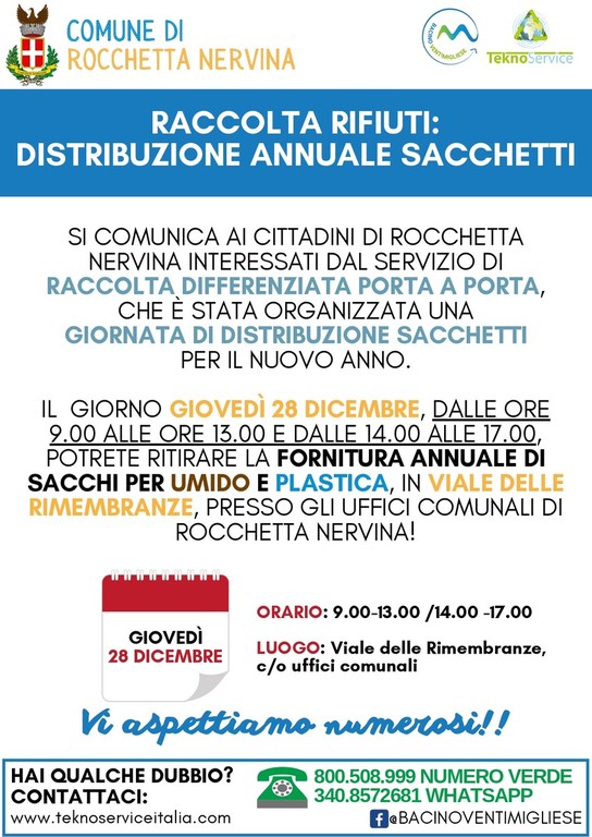 Il Comune di Rocchetta Nervina comunica ai cittadini interessati dal servizio di raccolta differenziata porta a porta che è stata organizzata una giornata di distribuzione sacchetti per il nuovo anno.
