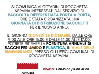 Il Comune di Rocchetta Nervina comunica ai cittadini interessati dal servizio di raccolta differenziata porta a porta che è stata organizzata una giornata di distribuzione sacchetti per il nuovo anno.