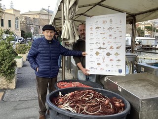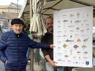 Crostacei, Molluschi, Pesci ossei, Pesci cartilaginei, belle immagini di molti animali marini che i nostri pescatori catturano ed offrono al pubblico sui loro banchi a Portovecchio. Pescato a chilometro zero. Il Presidente Onorario Gustavo Ottolenghi, insieme al Console Didier Corte, hanno valutato come e dove posizionare il pannello, per la migliore visibilità.