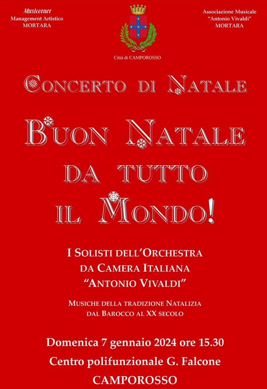 Musiche della tradizione natalizia dal Barocco al XX secolo, invece, domenica prossima animeranno il centro polifunzionale G. Falcone. "Domenica 7 gennaio alle 21, sempre nel centro Falcone, andrà in scena il grande concerto 'Buon Natale da tutto il mondo' dei Solisti dell’Orchestra di Musica da Camera Italiana 'Antonio Vivaldi'" - dice Gibelli - "Vi aspettiamo numerosi!".