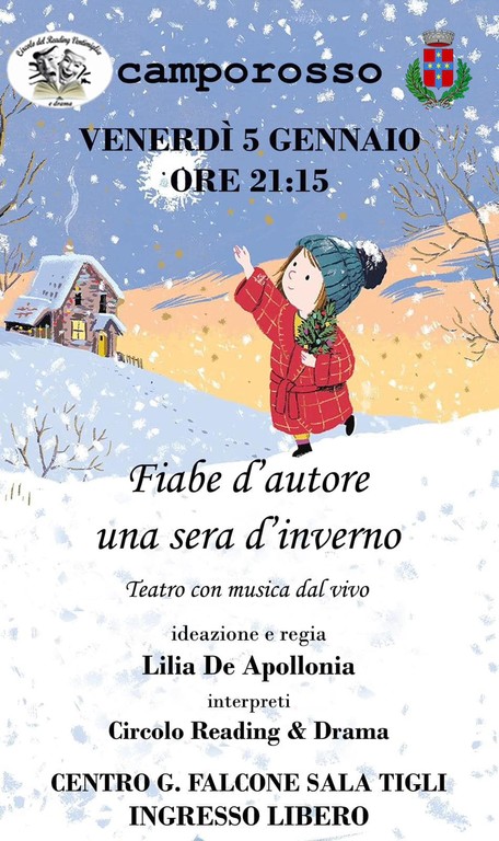 Teatro con musica dal vivo intratterrà residenti e turisti venerdì prossimo. "Il primo appuntamento si svolgerà venerdì 5 gennaio alle 21.15 nel centro Falcone di Bigauda con lo spettacolo teatrale 'Fiabe d’autore una sera d’inverno' a cura del 'Circolo Reading & Drama' fondato da Lilia De Apollonia" - fa sapere il primo cittadino.