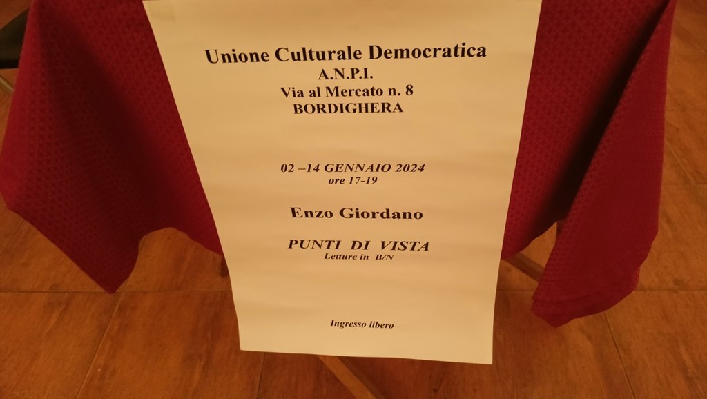 A Bordighera, nella sede dell'Unione Culturale Democratica-Anpi, fino al 14 gennaio si potrà visitare la mostra di fotografia "Punti di vista - Letture in B/N" di Enzo Giordano.