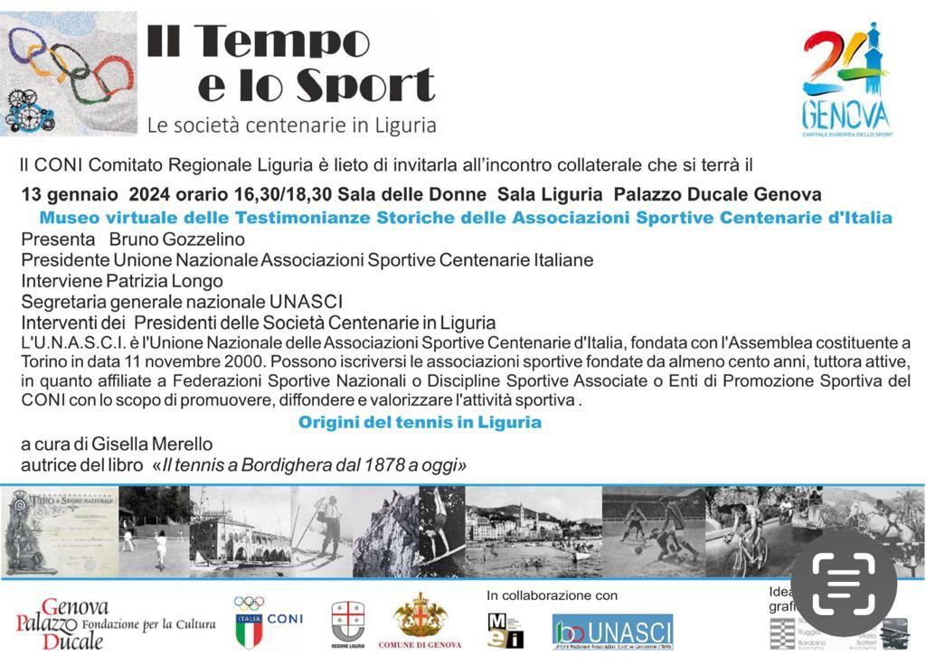 Un'evento, perciò, per parlare del tennis in Liguria che si terrà dopo l'incontro collaterale sul "Museo virtuale delle testimonianze storiche delle associazioni sportive centenarie d'Italia" durante il quale interverranno Patrizia Longo, segretaria generale nazionale Unasci e i presidenti delle società centenarie in Liguria. Bruno Gozzelino, presidente dell'Unione Nazionale Associazioni Sportive Centenarie Italiane, sarà il presentatore dell'evento e illustrerà le attività dell’associazione e il museo virtuale dove le società riconosciute come centenarie possono esporre i loro cimeli e documenti. Si ricorderanno, quindi, grandi eventi e tante manifestazioni che hanno coinvolto il pubblico genovese ed internazionale.