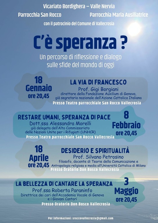 Un percorso di riflessione e dialogo sulle sfide del mondo di oggi, dal titolo "C'è speranza?", verrà proposto da due parrocchie di Vallecrosia: San Rocco e Maria Ausiliatrice. Da gennaio a maggio si terranno, infatti, quattro interessanti incontri con il patrocinio del comune di Vallecrosia.