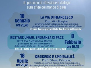 Il primo appuntamento sarà il 18 gennaio alle 20.45 presso il teatro parrocchiale di San Rocco. Per l'occasione, il professor Gigi Borgiani, direttore della Fondazione Auxilium di Genova, già segretario nazionale dell'Azione Cattolica Italiana, parlerà de "La via di Francesco". L'8 febbraio, sempre alle 20.45 presso il teatro parrocchiale di San Rocco, la dottoressa Alessandra Morelli, già delegata dell'Alto Commissariato delle Nazioni Unite per i Rifugiati (UNHCR) interverrà su "Restare umani, speranza di pace".
