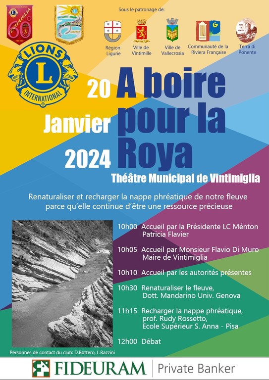 Nel corso dell'evento interverranno il presidente del Lions Club di Ventimiglia Senia Seno, il sindaco di Ventimiglia Flavio Di Muro, autorità provinciali e regionali, il dottor Mandarino, Cirf dell'Università di Genova, che parlerà di "Rinaturalizzare il fiume", il professor Rudy Rossetto della scuola superiore S. Anna di Pisa che illustrerà come "Ricaricare la falda". Infine, è previsto un dibattito.