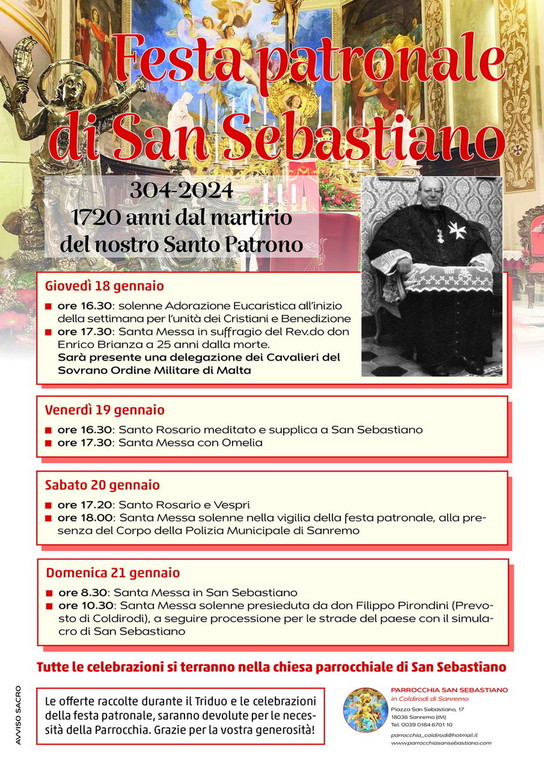 Sabato 20 gennaio, vigilia della festa, alle ore 17.20 la preghiera del Santo Rosario e dei Vespri a cui seguirà la Santa Messa delle ore 18.00 con la presenza del Corpo di Polizia Municipale di Sanremo che ricorda e si affida al suo Patrono.