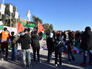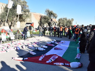 Tante bandiere palestinesi ma anche quelle di Pace mentre a terra tanti ‘fagotti’ per rappresentare i circa 7.000 bambini morti in questo periodo di crisi tra Palestina e Israele.