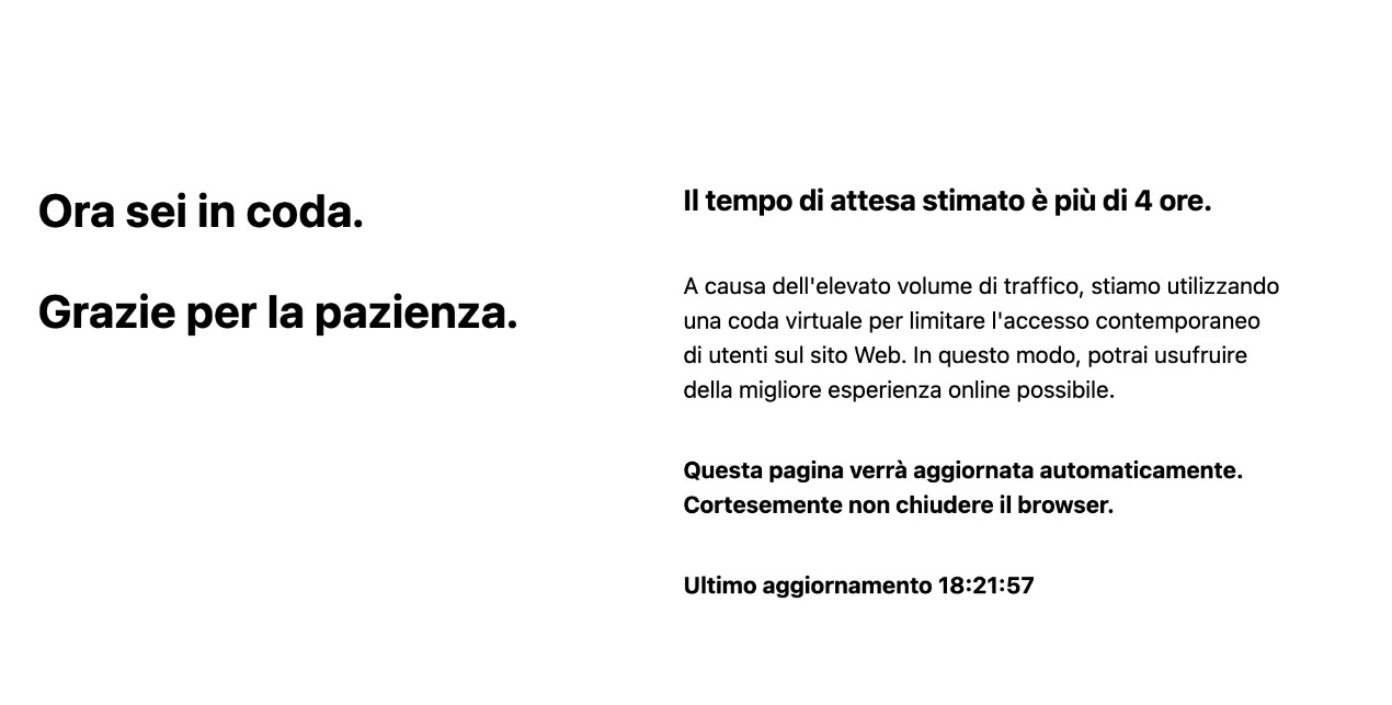 Il tempo d’attesa alle 18, nove ore dopo l’apertura delle vendite, era ancora di oltre quattro ore: “A causa dell'elevato volume di traffico, stiamo utilizzando una coda virtuale per limitare l'accesso contemporaneo di utenti sul sito Web. In questo modo, potrai usufruire della migliore esperienza online possibile”.