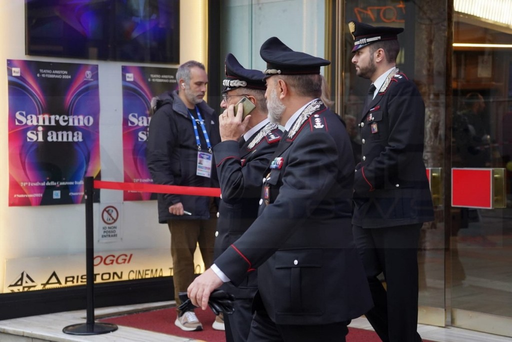 Sopralluogo dei Carabinieri, questa mattina al Teatro Ariston di Sanremo, in attesa della kermesse canora matuziana, per la quale in questi giorni si stanno svolgendo le prove.