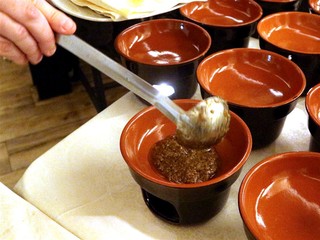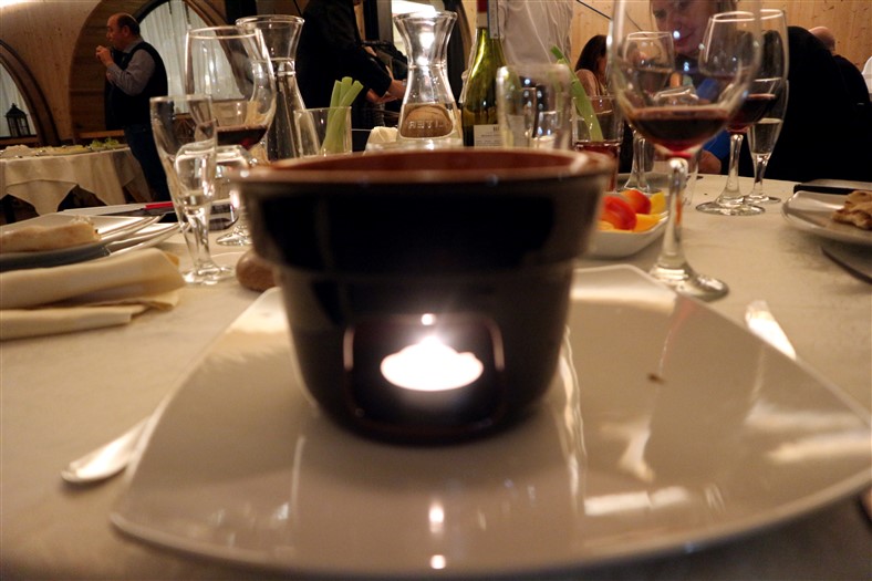 Accompagnata da verdure di stagione crude e cotte, questo piatto tipico della cucina piemontese a base di aglio e acciughe, è stato servito nei fujot di terracotta con il lumino acceso per tenere in caldo la salsa. Lo chef Flavio Ottonello ha sapientemente creato la giusta consistenza, mantenendo l'equilibrio tra gli ingredienti ed ottenendo una perfetta armonia di sapori.
