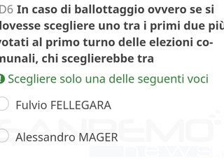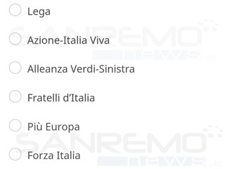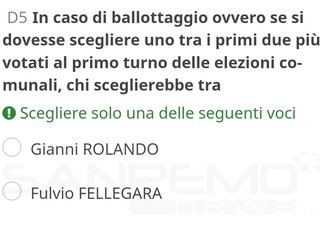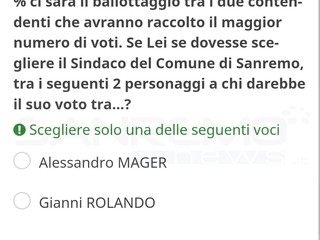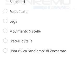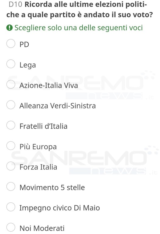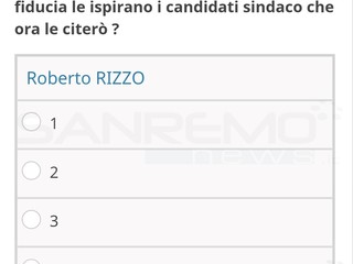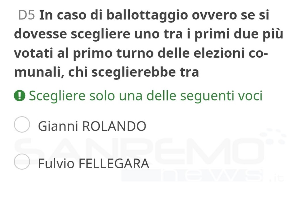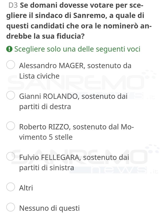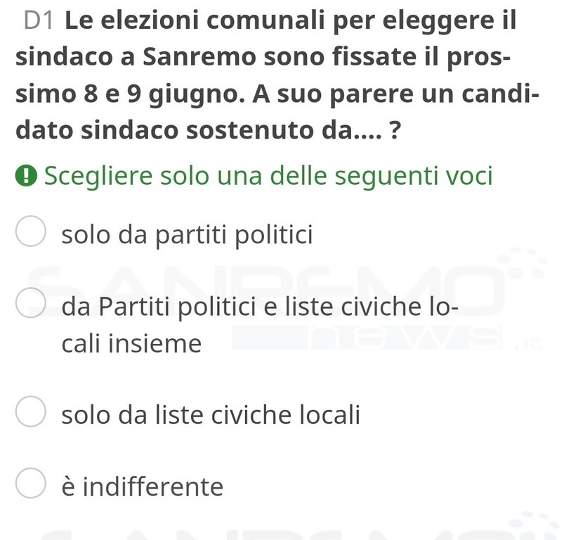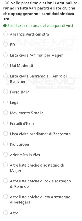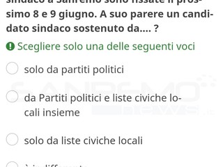 Dopo aver inserito la provincia e la città di residenza viene chiesto: “Le elezioni comunali per eleggere il sindaco a Sanremo sono fissate per il prossimo 8 e 9 giugno. A suo parere un candidato sindaco sostenuto da…? Le possibili risposte sono: solo da partiti politici, da partiti e liste civiche locali insieme, solo da liste civiche locali oppure è indifferente.
