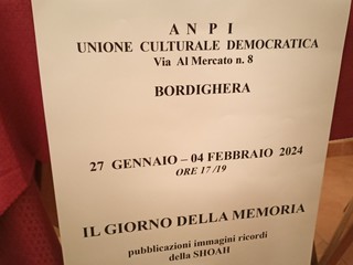 Pubblicazioni, libri, documenti e immagini in ricordo della Shoah si possono ammirare nella sede dell'Anpi-Unione Culturale Democratica a Bordighera fino al 4 febbraio. E' stata inaugurata ieri pomeriggio, con un documentario sulla Shoah, la mostra dedicata al "Giorno della Memoria".