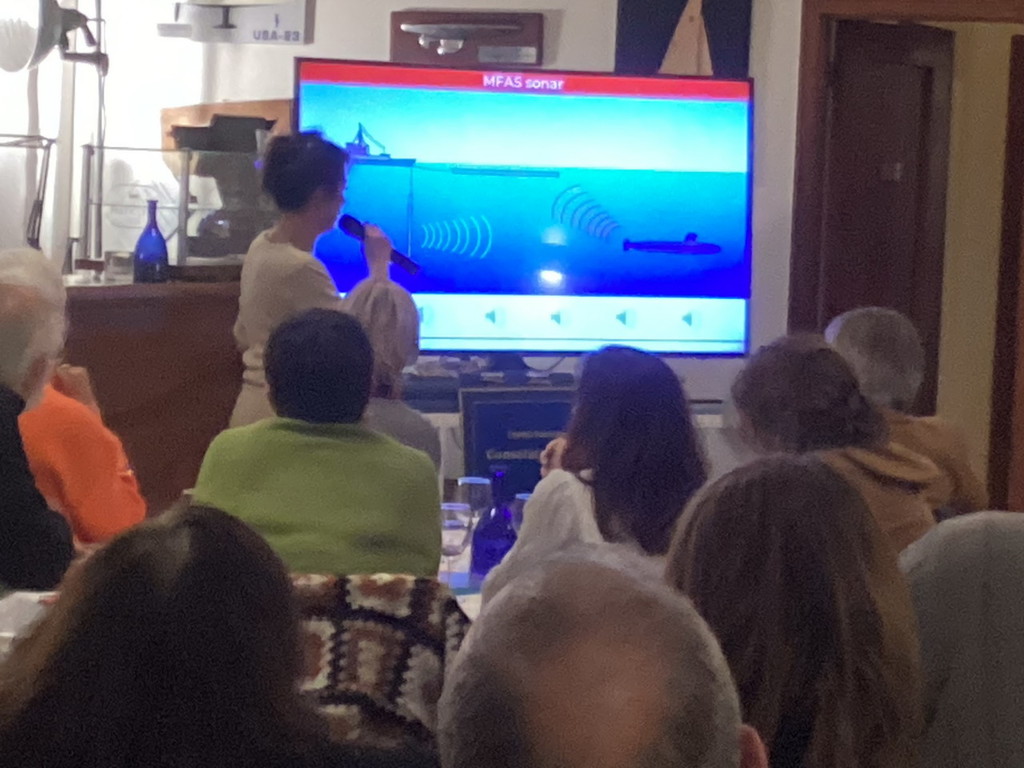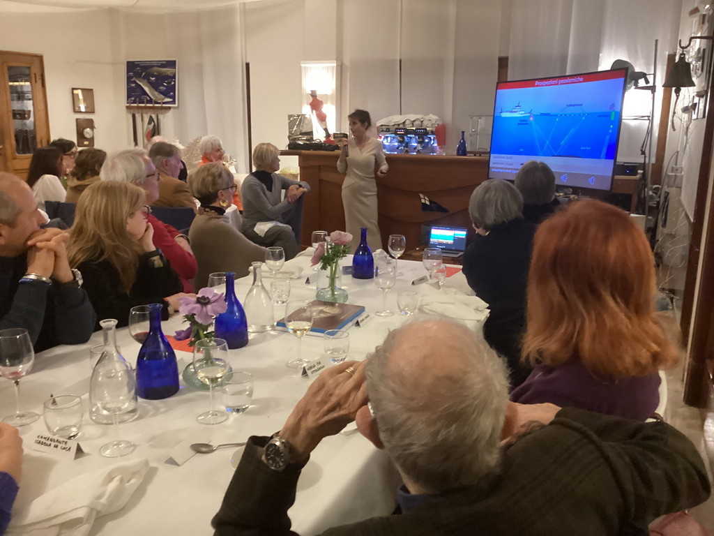 Altri tipi di gamberi, i gamberi pistoleri, che usano una grossa chela per aggredire le loro prede scatenando un rumore di circa 200 db! I pesci 'Scienidi', come le ombrine e le corvine, che producono suoni con la loro vescica natatoria, come dei borbottii, ben udibili dai subacquei. Ma la vera magia che ci ha portato Sabina Airoldi sono tutti i suoni, clics, vibrazioni, di diversi cetacei. Dal fondamentale 'fischio firma'. ai canti dei grandi cetacei maschi per ammaliare le femmine. L’ascolto, l’interesse, il piacere di essere insieme ed anche una cena di qualità hanno contribuito al successo della serata. Giovanni Manuguerra per Il Consolato del Mare e lo Yacht Club Sanremo, ringrazia Sabina Airoldi per aver saputo ricreare una atmosfera magica, pur nella più rigorosa scienza della biologia marina. Ricorda a tutti i presenti che il prossimo incontro sul Mare allo Yacht Club Sanremo sarà il 16 Febbraio".