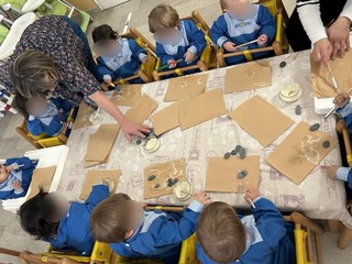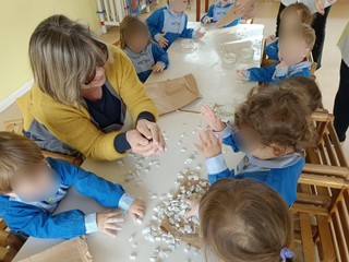 I piccoli hanno potuto sperimentare la tecnica del ‘risseau’ (in genovese ‘ciottoli’). Con l'utilizzo di una colla a base di acqua e farina i bambini hanno posato su una base di carta delle pietroline raccolte in spiaggia. Una volta asciugate, le sezioni di ciottoli verranno staccate dalla carta e incollate con una colla cementizia direttamente sulla base di legno nel quadro preparato per l'occasione.