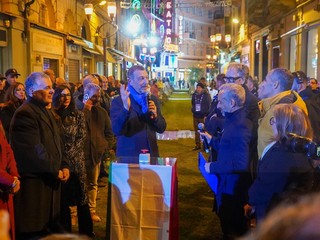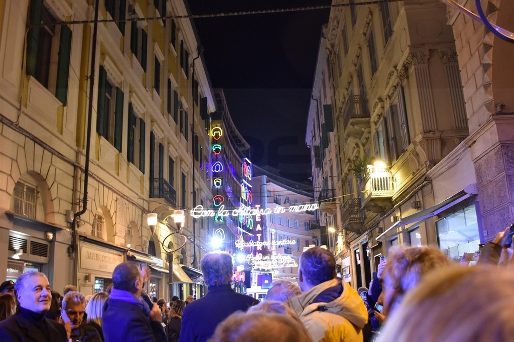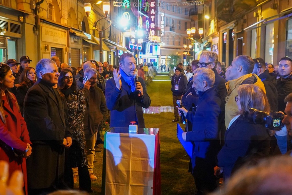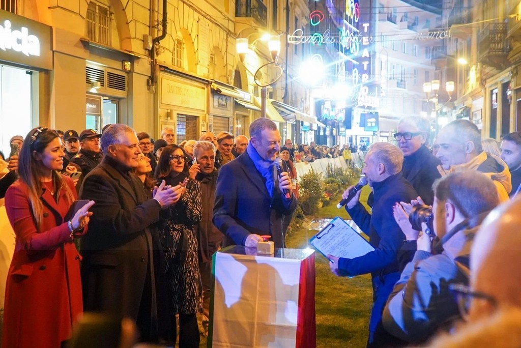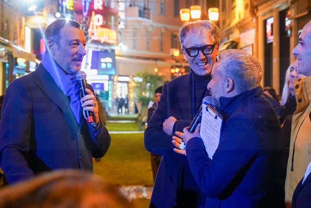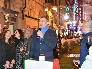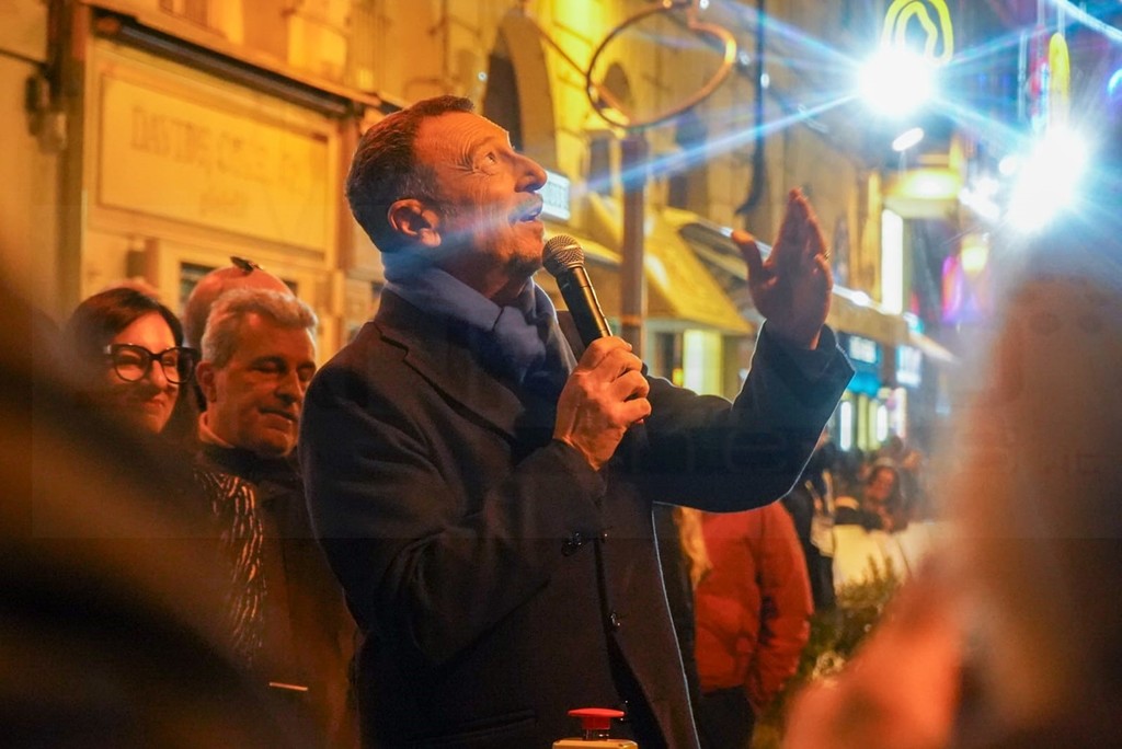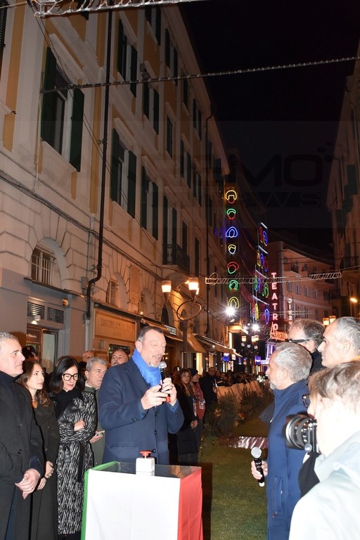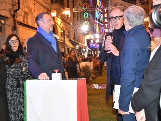 Amadeus, il Sindaco Alberto Biancheri e l’Assessore al Turismo Giuseppe Farladi, insieme a buona parte di Amministrazione e dei Consiglieri comunali, hanno acceso all’ingresso di via Matteotti le luminarie dedicate a Toto Cutugno e alla canzone ‘L’Italiano’, una vera icona della musica tricolore nel mondo.