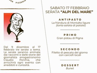 Il prossimo appuntamento della rassegna gastronomica “Il sabato del Villaggio” è programmato per sabato 17 febbraio alle ore 20.00 con una serata dedicata ai sapori e profumi delle Alpi del Mare.