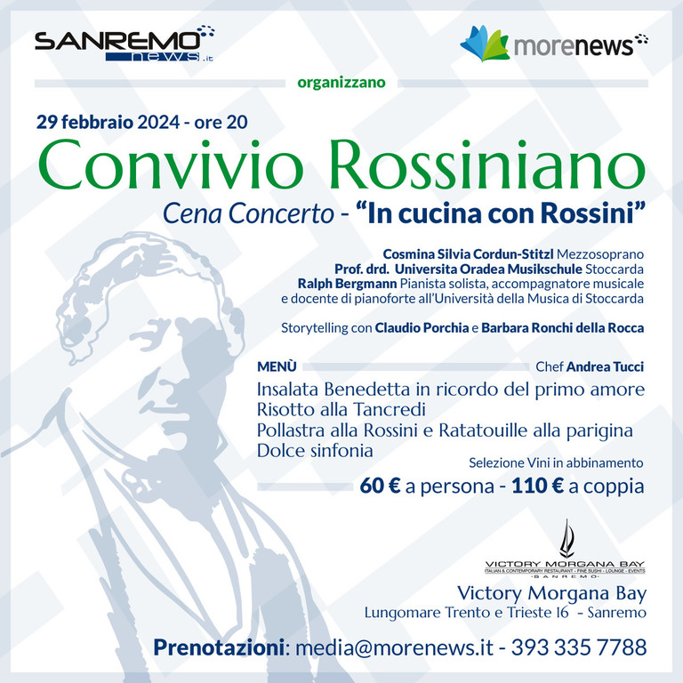 L’appuntamento è fissato per il 29 febbraio 2024 alle ore 20.00 presso il Victory Morgana Bay in Lungo mare Trento e Trieste n.16 a Sanremo.